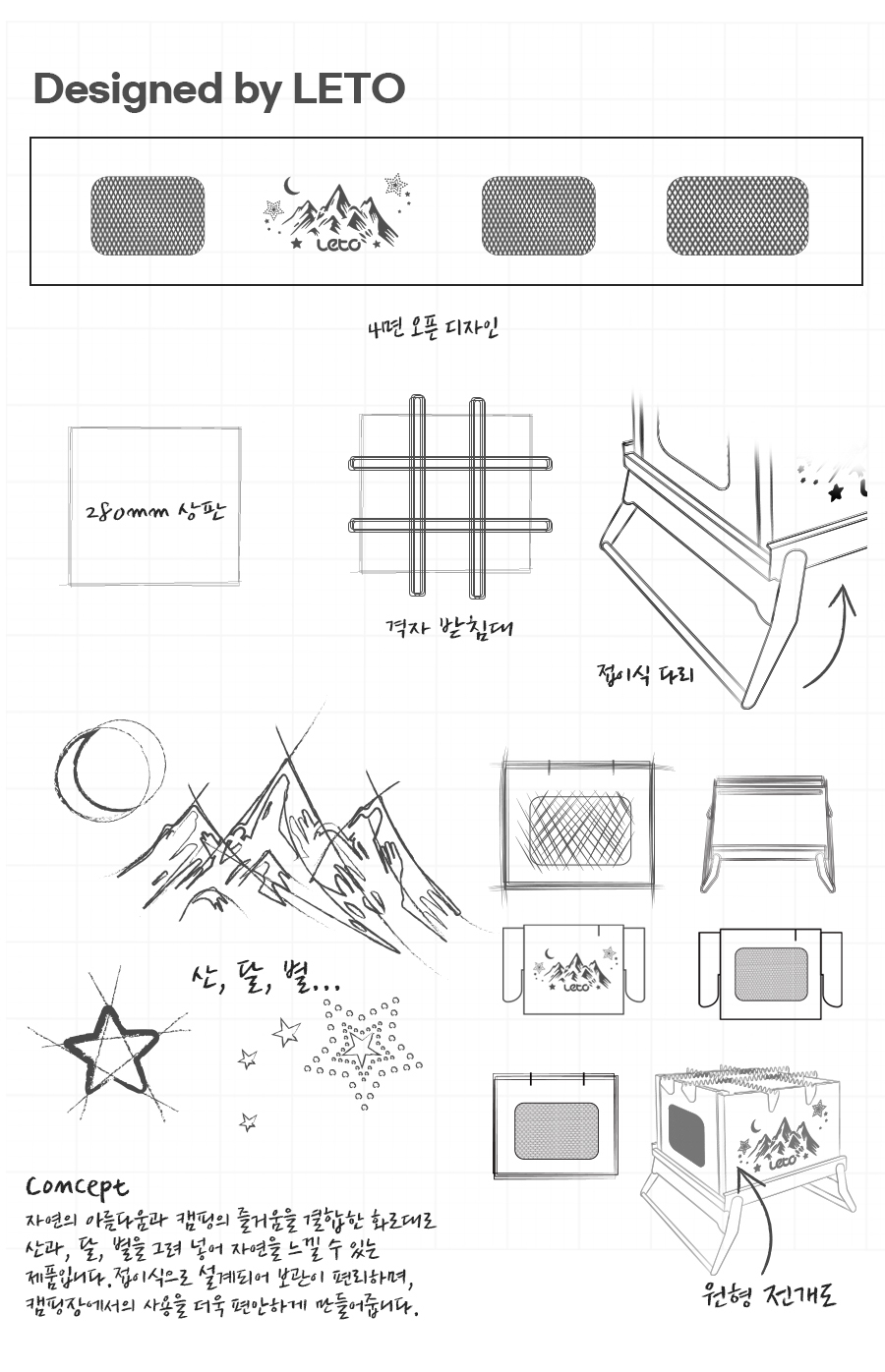 레토(LETO) 오픈뷰 접이식 사각 캠핑 화로대 (LCP-FS05)는 감성 캠핑의 필수 아이템인 '불멍'을 극대화하기 위해 설계된 제품입니다. 견고한 스테인리스 스틸 소재와 간편한 접이식 구조, 그리고 사방에서 불꽃을 감상할 수 있는 오픈뷰 디자인이 특징입니다.