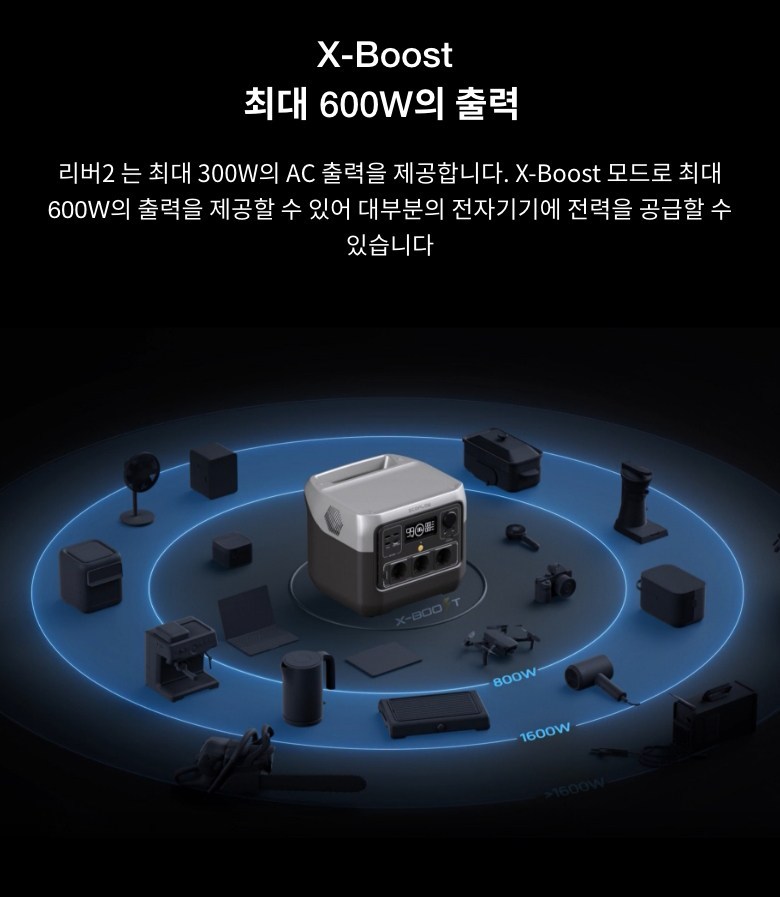정격 출력은 300W지만, X-Boost 모드를 켜면 순간적으로 최대 600W급 기기(소형 전기포트, 블렌더 등)도 사용 가능하여 활용도가 더욱 높아집니다.
