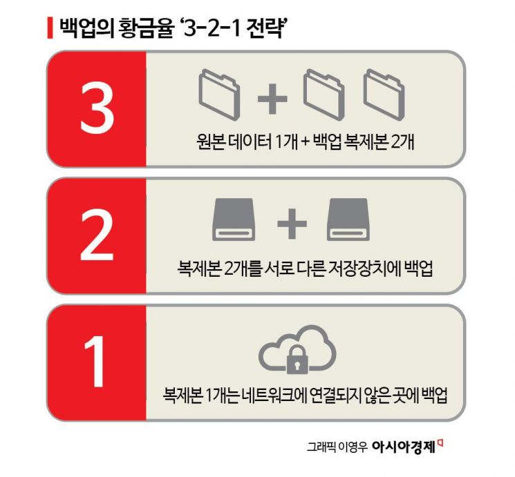 A. 랜섬웨어 등 최악의 상황에서도 내 데이터를 지키는 황금률입니다. 3개의 데이터 복사본을, 2개의 다른 종류의 저장매체(예: PC 하드, 외장하드)에 보관하고, 그중 1개는 물리적으로 다른 장소(예: 클라우드, 다른 집)에 보관하라는 뜻입니다.