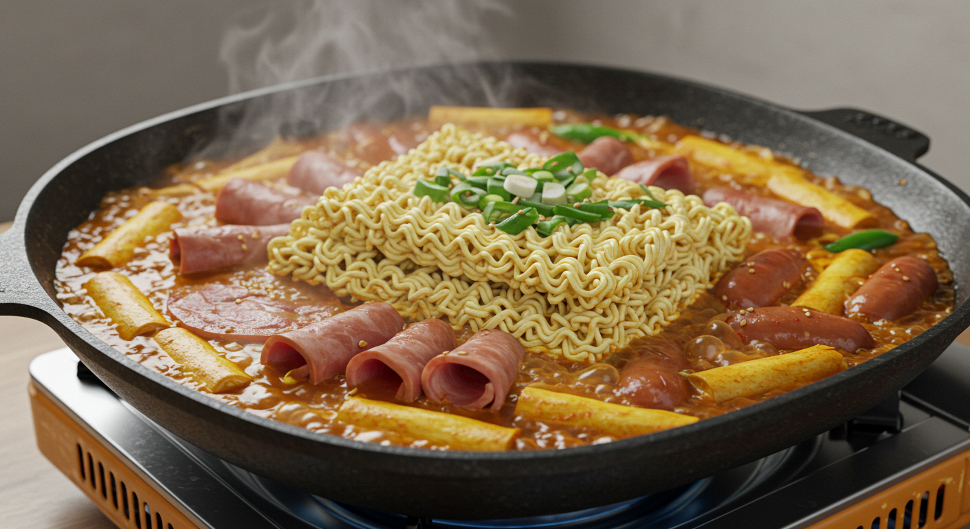 - 재료: 햄, 소시지, 잘 익은 김치, 두부, 양파, 대파, 라면사리, 고춧가루, 다진 마늘