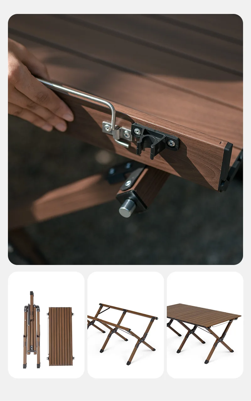 실용성만 챙긴 것이 아닙니다. 가볍고 튼튼한 블랙/월넛 컬러의 알루미늄 상판과 측면의 원목 포인트가 어우러져 감성 캠핑의 분위기를 한층 살려줍니다. 어떤 캠핑 사이트에서도 잘 어울리는 세련된 디자인입니다.