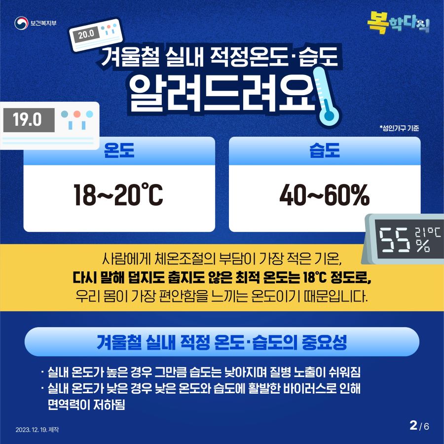 - 적정 온도 유지: 겨울철 적정 실내 온도는 20~22℃입니다. (온돌 모드는 40~50℃)