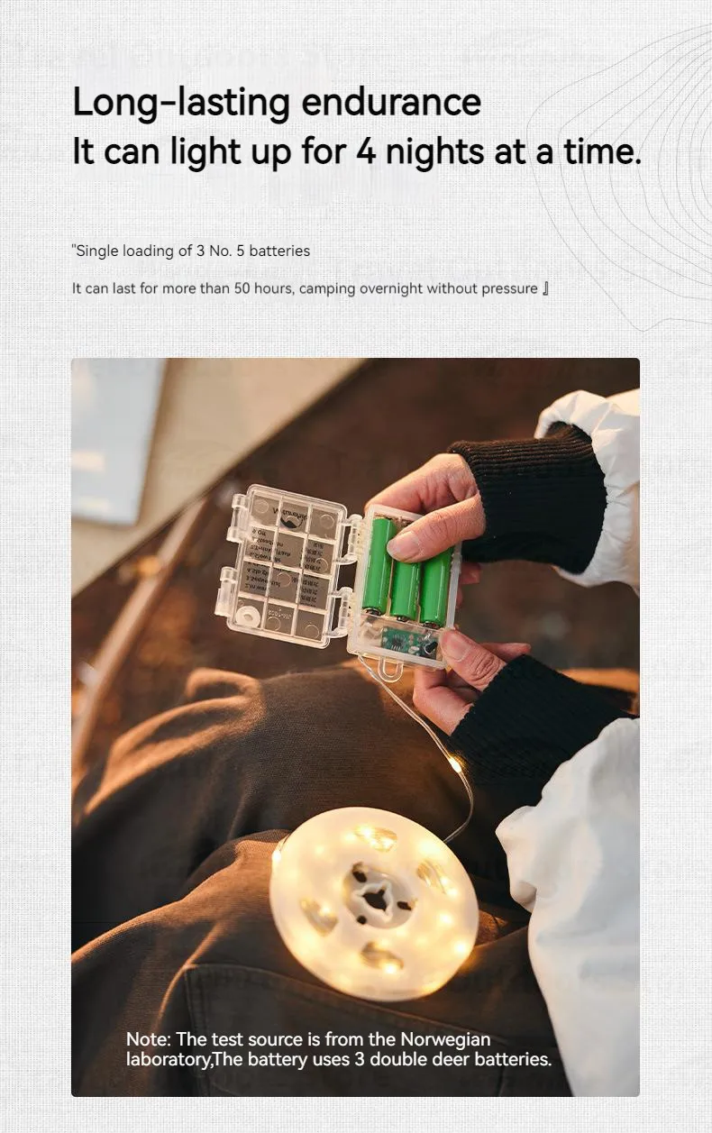 총 길이 10m에 20구의 LED 구슬 조명이 약 50cm 간격으로 배치되어 있습니다. 텐트 주변을 감싸거나 타프 아래 전체를 밝히기에 충분한 길이와 밝기를 제공합니다.