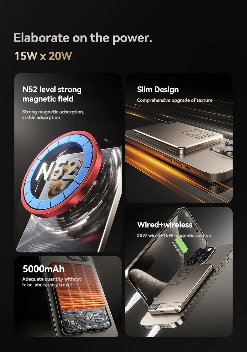 아이폰 12~16 시리즈 사용자라면 환호할 기능입니다. 강력한 마그네틱으로 폰 뒷면에 '착'하고 달라붙어 흔들림 없이 충전됩니다. 별도의 케이블 없이 폰과 배터리를 한 손에 쥐고 통화하거나 게임을 즐길 수 있습니다.