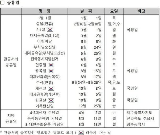 | 월 | 날짜 및 요일 | 공휴일 명칭 | 비고 |