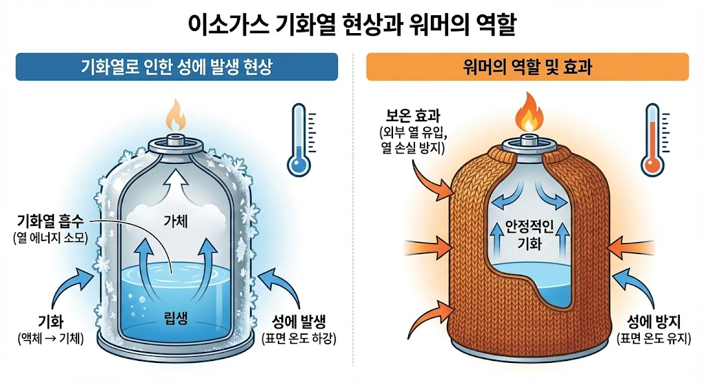 이소가스 워머는 '패딩' 역할을 합니다. 가스통 스스로의 온도를 뺏기지 않게 단열을 해주는 것이죠. 특히 히팅형 워머는 아예 '전기장판'처럼 열을 공급해서 영하권에서도 가스가 콸콸 나오게 만들어줍니다. 안전과 효율을 위해선 선택이 아닌 필수입니다.