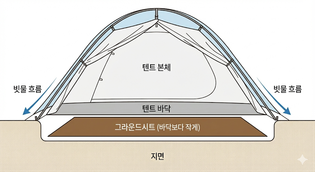- 그라운드시트: 텐트 바닥보다 조금 작게 깔아야 빗물이나 결로가 타고 들어오지 않습니다.
