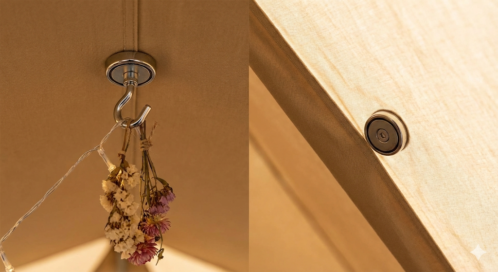 무거운 랜턴이나 두꺼운 겨울 장식을 걸려면 다이소 자석보다 더 강력한 제품이 필요할 수 있습니다. 텐트 스킨 보호용 패드도 함께 쓰면 금상첨화!