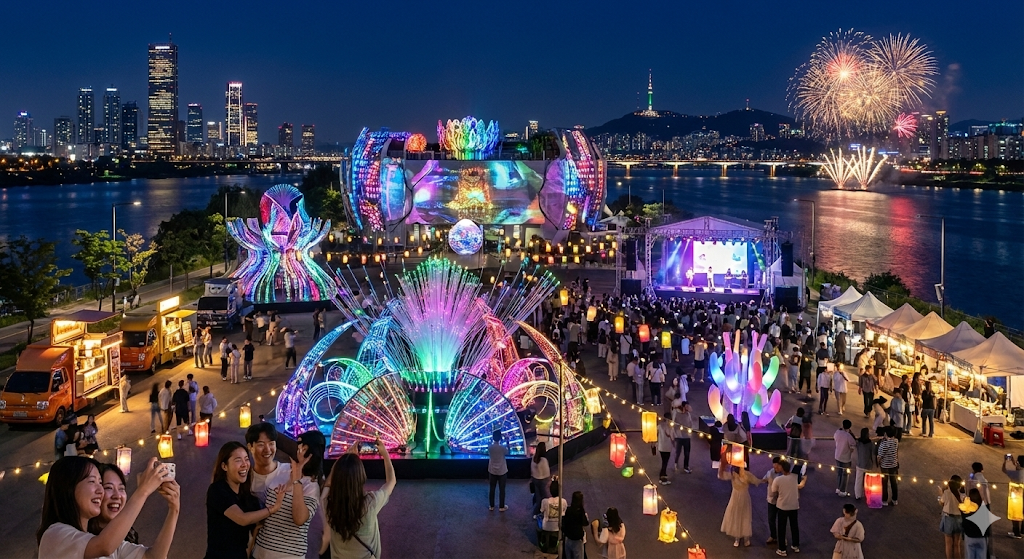 - 한강 야경 배경: 조명 조형물과 뒤로 보이는 한강 다리의 불빛이 어우러진 뷰.