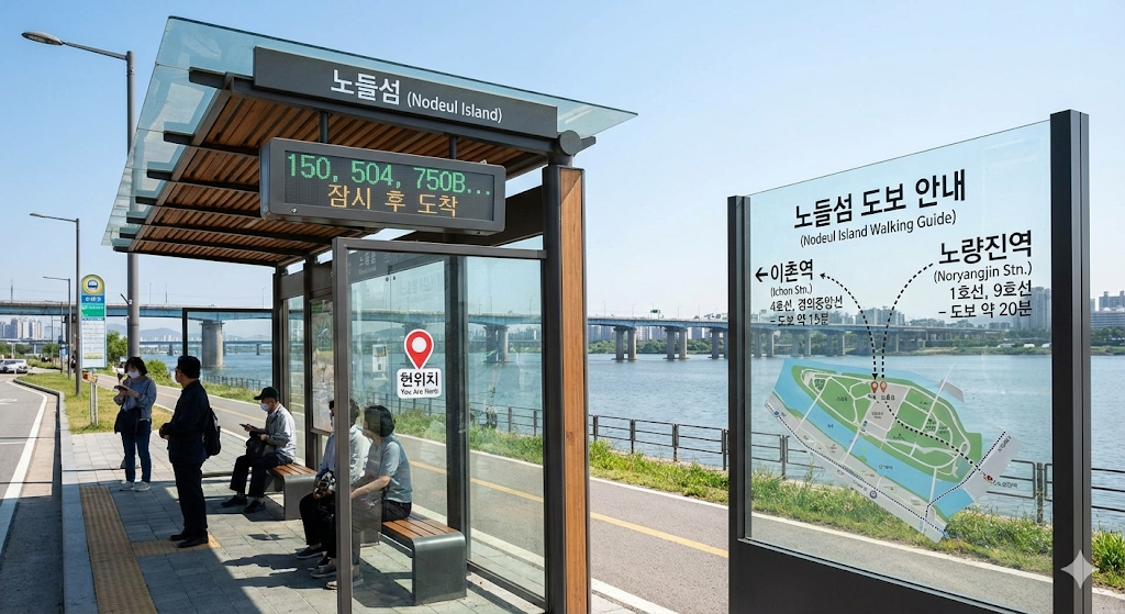 - 노들섬 방면 버스 탑승 → '노들섬 정류장(03-340)' 하차