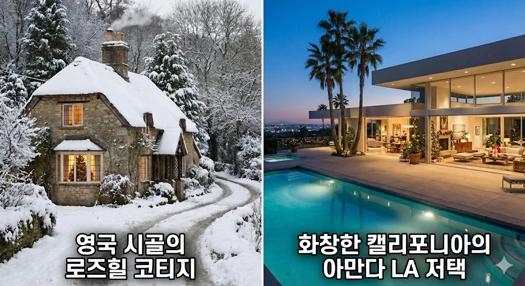 눈 덮인 영국의 고즈넉한 시골 풍경과 햇살 가득한 LA의 화려한 저택을 오가며 보는 시각적 즐거움이 엄청납니다. 특히 영국의 '로즈힐 코티지'는 겨울 감성의 끝판왕을 보여줍니다.