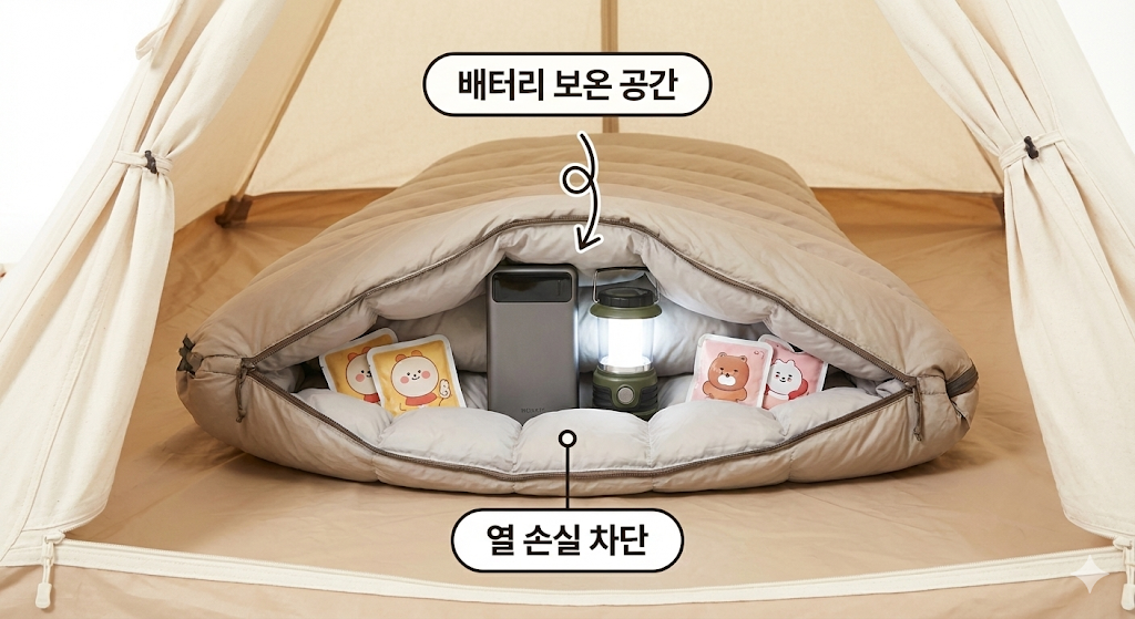 - 배터리 보온: 추운 날엔 배터리 성능이 20% 이상 떨어집니다. 랜턴과 보조배터리는 사용하지 않을 때 침낭 속이나 보온 가방에 넣어두세요.