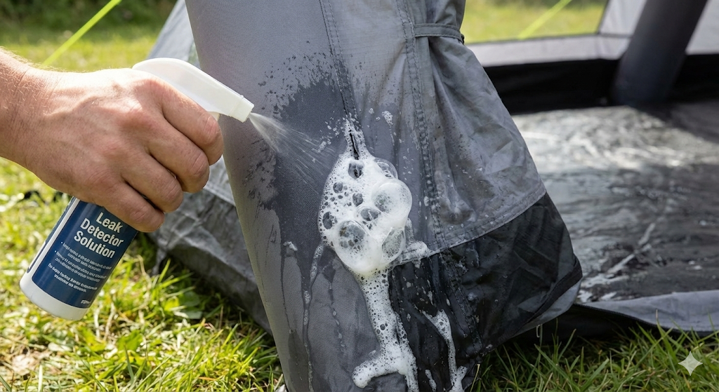 대부분 텐트 구매 시 수선 키트가 포함되어 있지만, 잃어버렸다면 온라인에서 '에어텐트 수선 키트'를 구매하세요. (TPU 패치 + 전용 접착제 필수)
