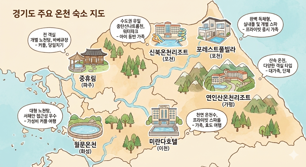 | 신북온천리조트 (포천) | 수도권 유일 중탄산나트륨천, 워터파크 시설 | 아이 동반 가족 |