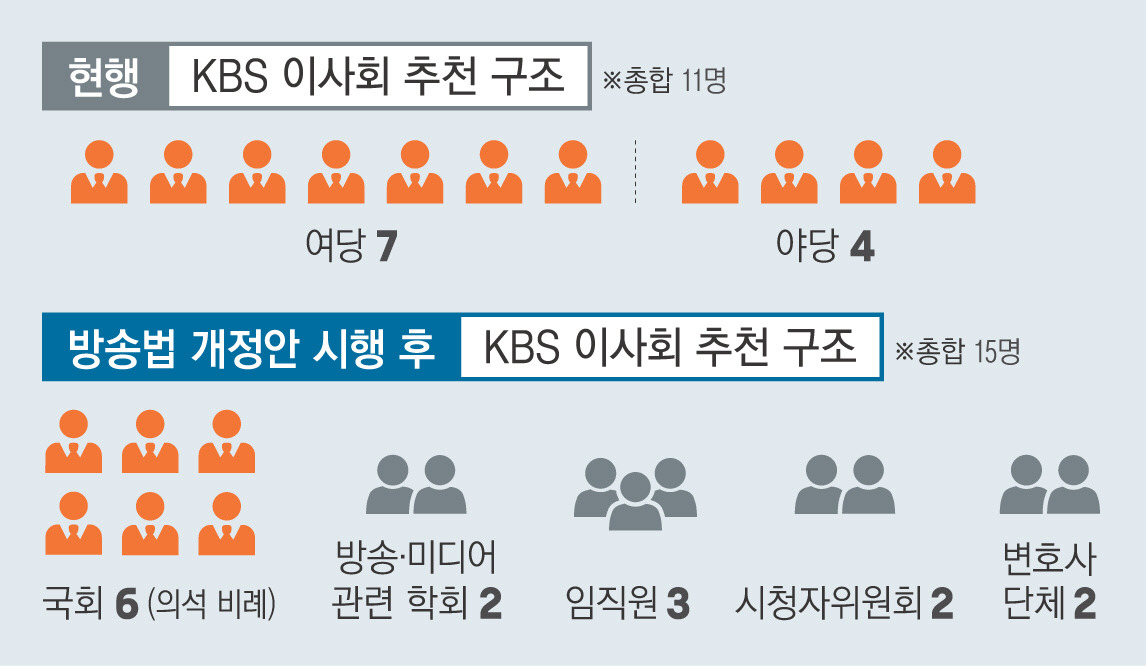 | KBS 이사회 | • 총 11명 • 여당 7명, 야당 4명 추천 |