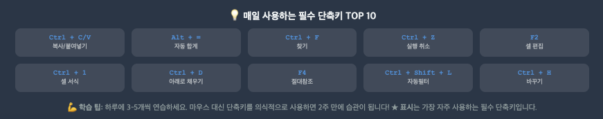 | Alt + = | 자동 합계 (SUM) | ⭐⭐⭐⭐⭐ |