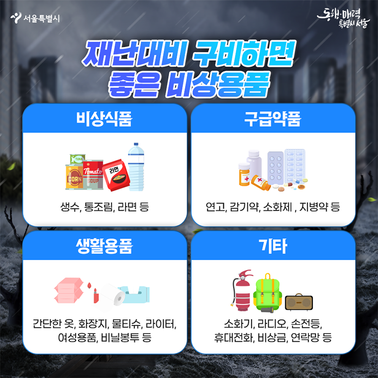 - ✔️ 비상용품 준비: 가장 중요한 부분입니다! 아래 표를 보고 우리 집에 비상용품이 잘 구비되어 있는지 꼭 확인하세요.