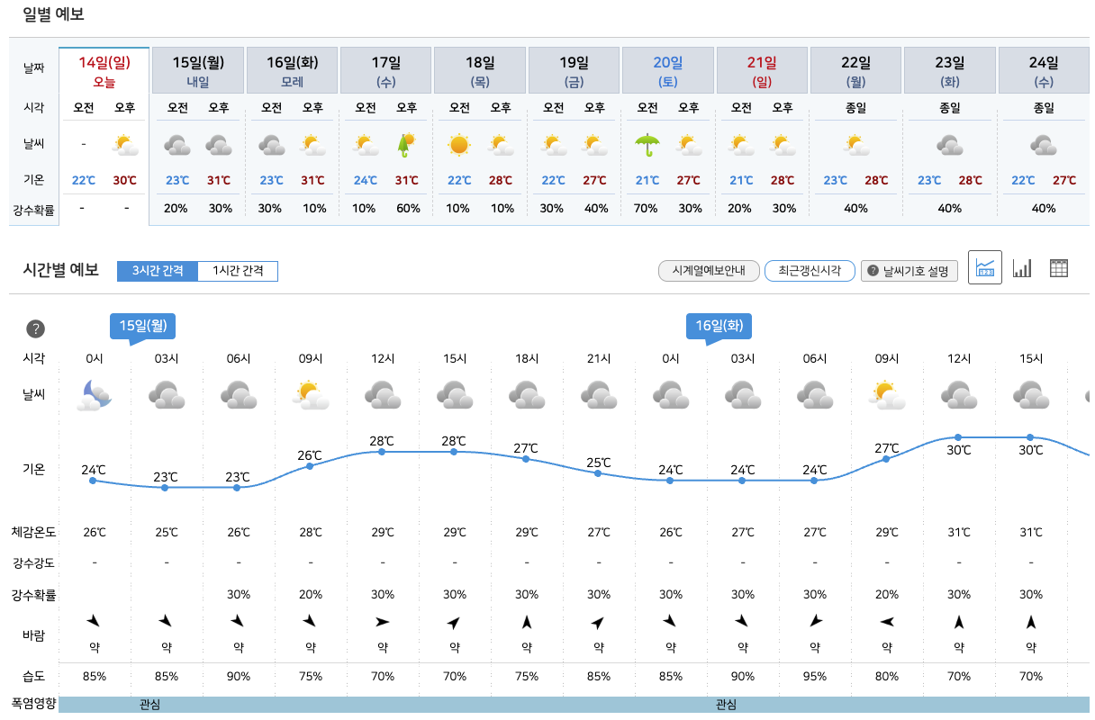 | 수요일 (17일) | 비 소강상태, 흐림 |
