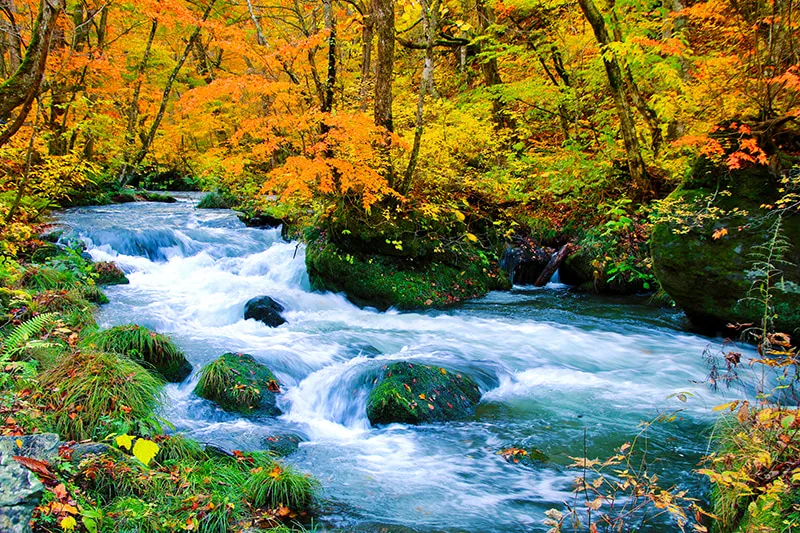 2️⃣ 아오모리 (아오모리 현): 일본의 첫 단풍을 가장 먼저 만나고 싶다면 정답은 여기! 10월이면 '오이라세 계류'를 따라 펼쳐지는 단풍의 절경은 평생 잊지 못할 추억을 선사합니다. 빨갛게 익은 사과 따기 체험은 덤!