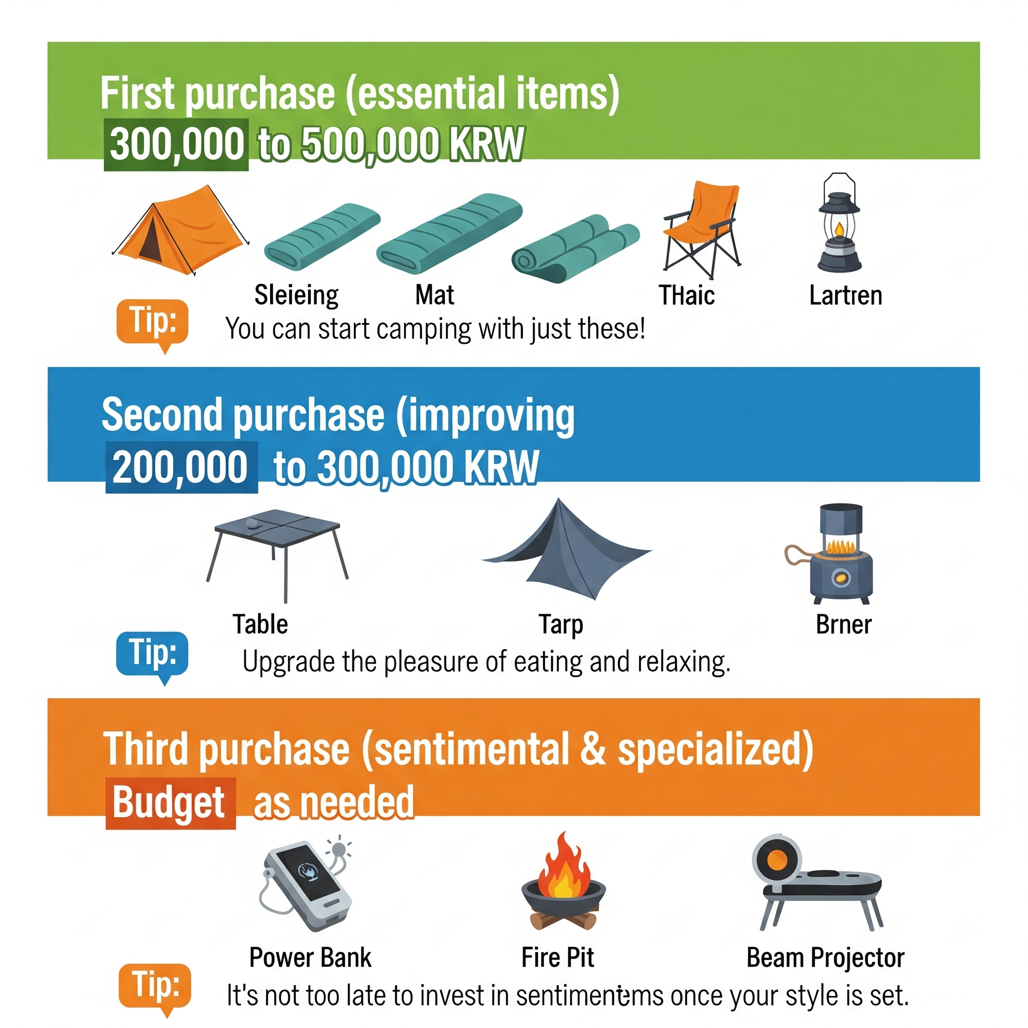 현명한 캠핑 장비 구매의 핵심은 **"경험이 우선, 장비는 나중"**입니다. 처음부터 모든 것을 사려는 욕심을 버리고, **텐트, 침낭, 매트, 의자** 등 최소한의 장비로 시작하세요. 캠핑을 몇 번 다녀보며 내가 정말로 불편하고, 필요한 것이 무엇인지 깨달았을 때 하나씩 추가하는 것이 중복 투자를 막는 최고의 방법입니다. **중고 장터**를 활용하는 것도 아주 똑똑한 시작입니다.